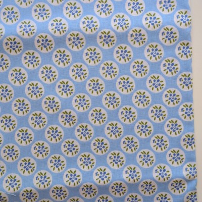 Tela de algodón con motivo de flores en fondo azul. Perfecta para patchwork, manualidades, complementos, bolsos o decoración.